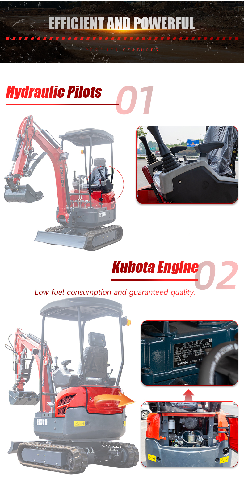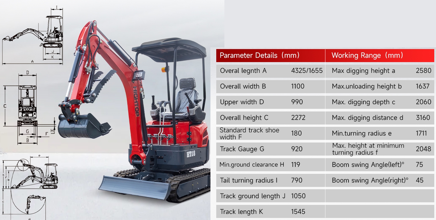 Minibagr Zethos HT1800 s prodlouženým ramenem pro hluboké kopání a otočená hlavní pístnice je spolehlivý a výkonný stroj vhodný pro široké spektrum stavebních, zemních a výkopových prací. Díky kompaktním rozměrům je ideální pro použití ve stísněných prostorách nebo na menších staveništích. Pohon zajišťuje tříválcový japonský dieselový motor KUBOTA o výkonu 10,2 kW, který nabízí vysokou efektivitu, nízkou spotřebu a dlouhou životnost. Maximální rychlost pohybu je 2,1 km/h a horní stavba se může otáčet o 360°, což usnadňuje manipulaci i v omezeném prostoru. Vysoká pracovní účinnost originálního "nesmrtelného" japonského motoru Kubota. Poloměr otáčení je malý. V případě omezeného pracovního prostoru nemusí obsluha počítat s překážkami na staveništi, které by bránily otáčení rypadla, takže se obsluha může soustředit na obsluhu lžíce, což výrazně zvyšuje efektivitu práce. Vlastnosti minihydraulického rypadla . Tento stroj je vybaven pístovým motorem s funkcemi vysoké a nízké rychlosti. Nízká rychlost může poskytnout silnější výkon, když rypadlo stoupá, vysoká rychlost je vhodná pro normální jízdu.