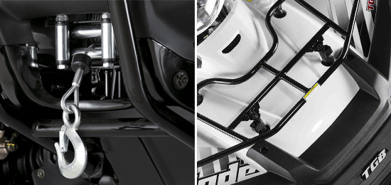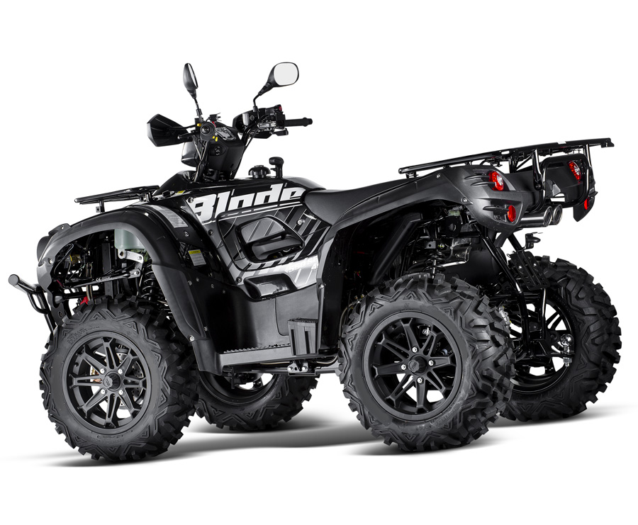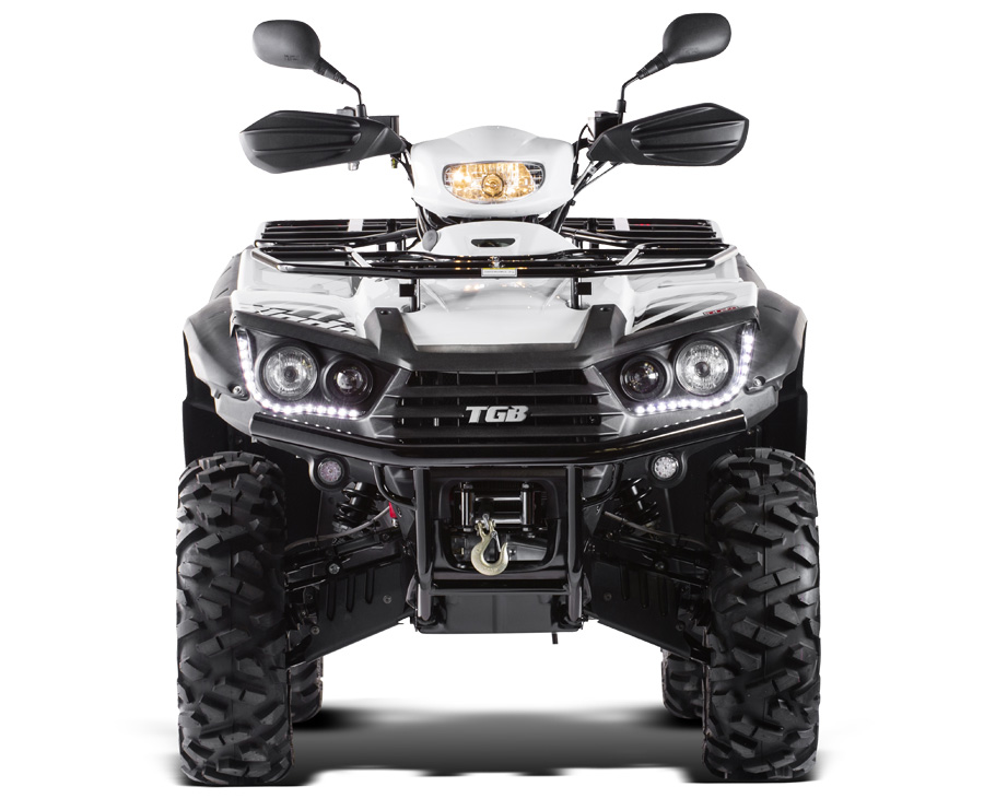Skvěle vybavená užitková a rekreační čtyřkolka střední třídy určená pro těžkou práci i víkendové výlety. Nad průměrem své třídy vyniká špičkovým poměrem ceny, kvality a užitné hodnoty, mimořádnou obratností a snadným a příjemným řízením. Při dlouhodobém používání navíc oceníte její vysokou robustnost, takže snese i nešetrné zacházení. Spolehlivý čtyřdobý jednoválec je vybaven elektronickým vstřikováním paliva, které zaručuje spolehlivé startování a dostatek výkonu a točivého momentu nezávisle na nadmořské výšce, velkou tažnou sílu a nízkou spotřebu paliva. Moderní nezávislé zavěšení všech kol IRS, velká světlá výška a široký rozchod dávají čtyřkolce vysokou stabilitu a špičkovou prostupnost terénem.Spolehlivý motor.Spolehlivý moderní kapalinou chlazený čtyřventilový jednoválec SOHC s velkou tažnou sílou a dostatkem výkonu pro každou situaci. Vyvinutý a vyráběný přímo v továrně TGB je motor vybaven spolehlivým elektronickým vstřikováním paliva, které nezávisle na teplotě a nadmořské výšce zaručuje snadné startování, čisté spalování a nízkou spotřebu. Spolehlivá automatická ´heavy-duty´ převodovka s polohami L/H/N/R (redukce do síly / dopředná rychlost / neutrál / zpátečka) a minimálními nároky na údržbu je navíc vybavená účinnou motorovou brzdou.Obratný podvozek Špičkovou průchodnost v terénu zajišťuje moderní plně nezávislé zavěšení všech kol iRS, široký rozchod, velká světlá výška a elektricky připojitelný pohon předních kol 2x4/4x4 pouhým stisknutím tlačítka na řídítkách. V nejtěžším terénu navíc oceníte rychle pracující elektrickou uzávěrku předního diferenciálu, která zajišťuje maximální trakci kol. Komfortně nastavený podvozek je odpérován vysoce kvalitními hydraulickými jednotkami s progresivně vinutými pružinami s nastavitelným předpětím.LED osvětlení.Atraktivní LED světla pro denní svícení zaujmou na první pohled. Společně s dvojitými zadními LED světly a LED blikači je TGB Blade ještě dospělejší a ještě přitažlivější. A když zajde slunce, výkonné projektorové světlomety vám vždy spolehlivě najdou cestu domů.Kotoučové brzdy.Brzdy jsou stejně důležité jako výkon. Výkonný tříkotoučový hydraulický brzdový systém s vrtanými kotouči a pancéřovanými brzdovými hadičkami vám dá důvěru při posunování vašich jezdeckých schopností. Hlavní nožní brzda brzdí současně všechna kola v poměru 60/40, pravou páčkou můžete navíc ovládat pouze přední brzdy, levou páčkou zadní. Parkovací brzda je ovládána samostatně.Multifunkční LCD displej.Přesné informace kdykoli potřebujete. Multifunkční LCD displej je nejen čitelný, ale i krásný, a nabízí spoustu funkcí: digitální otáčkoměr, digitální rychloměr, maximální dosažené otáčky motoru, maximální dosažená rychlost, průměrná rychlost, 2 počítadla denní ujeté vzdálenosti, počítadlo celkově ujeté vzdálenosti, denní počitadlo najetých motohodin, celkové počitadlo najetých motohodin, palivoměr, palubní hodiny a všechny potřebné kontrolky.Špičková výbava.Na trhu není mnoho čtyřkolek, které by v již tak atraktivní základní ceně ještě nabízely tak bohatou standardní výbavu, jako TGB Blade 550: elektrická uzávěrka předního diferenciálu, elektrické přepínání pohonu 2x4 / 4x4, pancéřované brzdové hadičky, atraktivní 8paprskové hliníkové disky, značkové 25" pneumatiky, třetí světlo v otočné kapličce na řídítkách, chrániče rukou a páček, robustní přední rám, přední i zadní nosič zavazadel, demontovatelné stupačky pro spolujezdce, tažné zařízení a spolehlivý naviják s vysokou tažnou silou 3000 lbs.