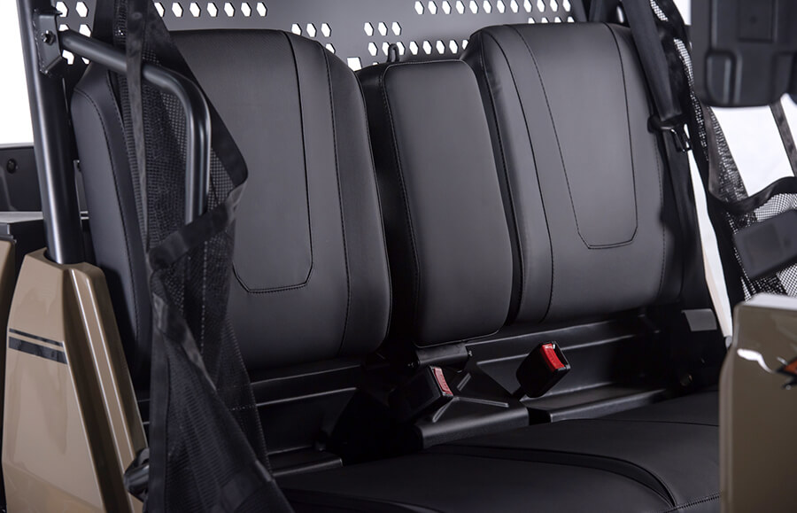 Sedačka je navržena tak, aby dva jezdci měli maximální pohodlí. Každé krajní místo je vybaveno vlastním bezpečnostním pásem a střední část lze snadno sklopit na praktickou opěrku s integrovanými držáky na nápoje. Po jejím vyklopení vznikne v případě potřeby i místo pro třetího pasažéra.