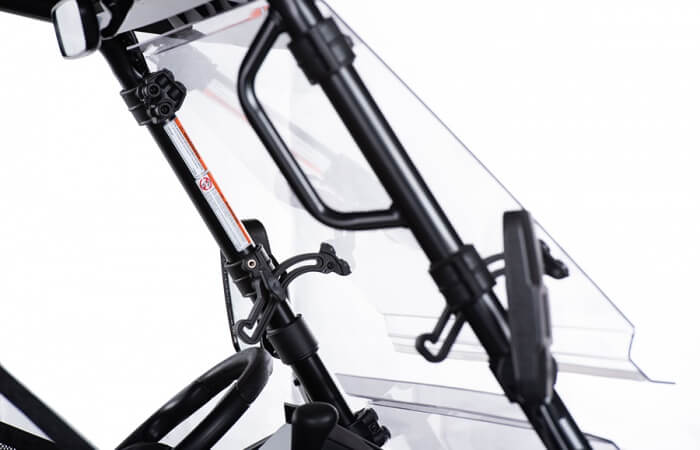 Dveře z pevného plastu spolehlivě chrání před větrem, prachem i odletujícími nečistotami. Jsou snadno ovladatelné a díky širokému úhlu otevření zajišťují pohodlný přístup do kabiny.