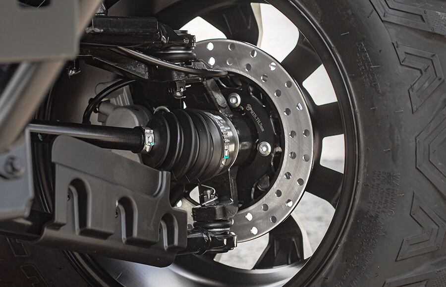 Kola jsou vybavena černými stylovými 14" hliníkovými disky, které stroji dodávají moderní a robustní vzhled. Upevnění ráfků je navrženo pro maximální odolnost a lepší chlazení brzd, což přispívá k celkové stabilitě a výkonu.