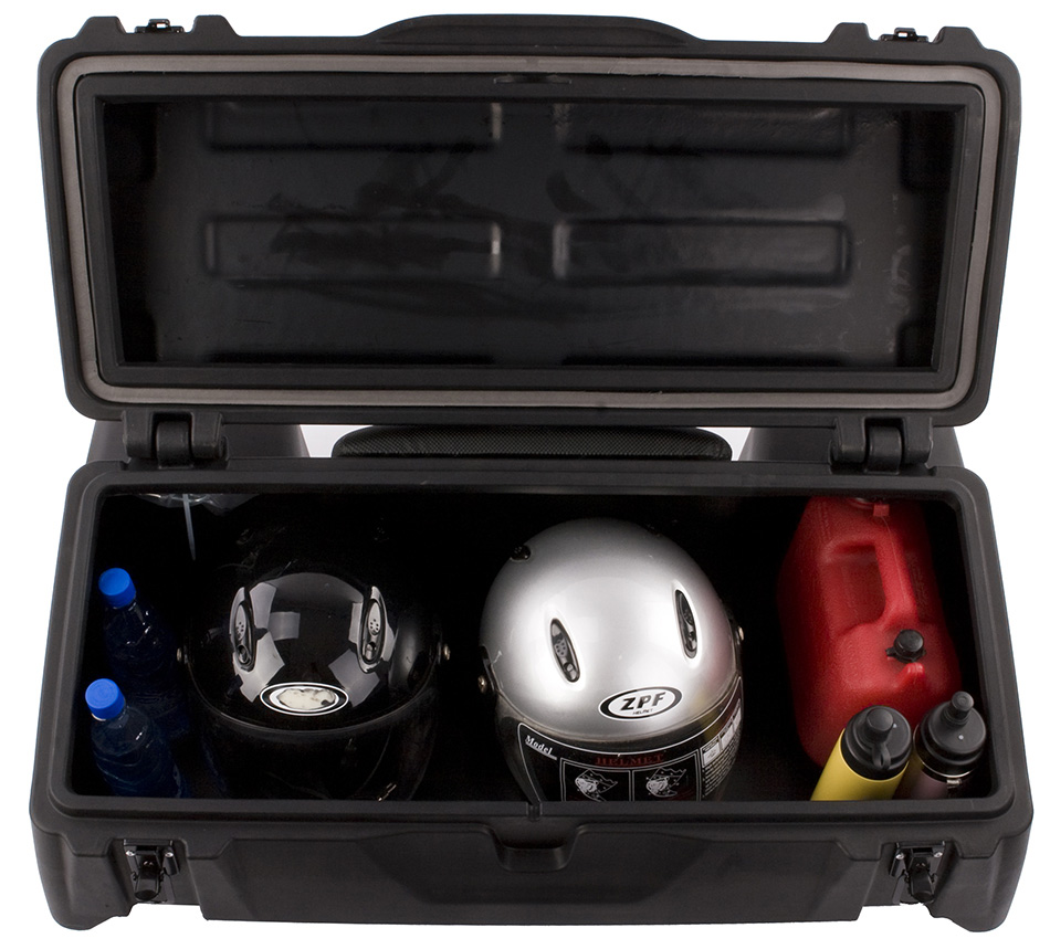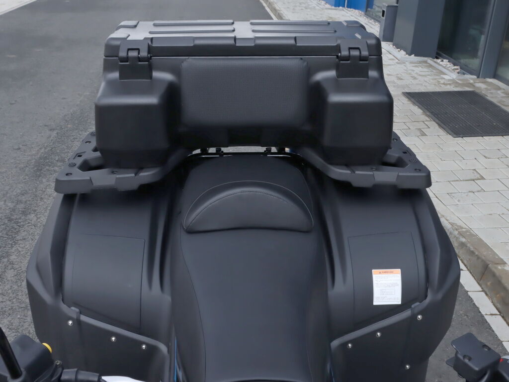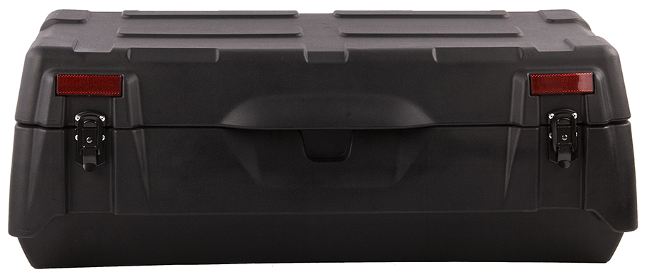 Velký uzamykatelný zadní box na čtyřkolku, objem 81 litrů, zamykání na dvě uzamykatelné západky, těsnění proti vodě, pohodlná čalouněná opěrka zad, dvě zadní odrazky, barva černá, rozměry 85 x 36 x 54(42) cm (Š x V x H)